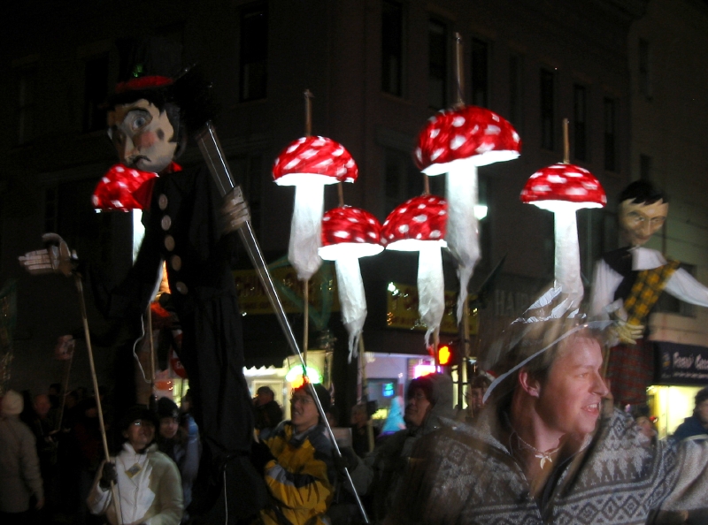 Throughout central Europe, New Year's Eve is known as Sylvester, after the Saint whose feast day falls on December 31. Two disctinct images emerged from our conversations about German customs on Sylvester: a chimney sweep and a poisonous mushroom. Many traditions require some form of cleansing to greet the New Year. Although many of these rituals involve water in some way (see Laotion, Ukrainian, Greek) the Central European tradition invokes fire instead, or more specifically the cleansing of the chimney and hearth. The appearance of the Chimney Sweep (in German, Schornsteinfeger) on the New Year is thought bring good fortune, and this ordinarily lowly figure is met with reverence and good cheer. Folk images of the Chimney Sweep often depict him spilling forth woth tokens of good luck, including the familiar four-leafed clover and the more regional "red fly" mushroom. The Chimney Sweep bearing gifts begs comparison to another seasonal fireplace visitor, Santa Claus (from the Dutch Sinterklaas, or "Klaus of the cinders"), thought by some mythologists to be in part derived from the Norse God Thor, whose traditional altar is the home hearth. The distinctive red-and-white coloring of the "red fly" mushroom (amanita muscaria) carried by the Chimney Sweep, seems to further reinforce these connections. The red fly mushroom is often described as poisonous, yet there is evidence that it had hullicinogenic propoerties that were valued both by pre-Christian shamans and early Christian gnostics. The noted ethnobotanist R Gordon Wasson even suggested that amanita muscaria may have been referred to in ancient Indian Vedic texts as the mystic plant, Soma, a bringer of wisdom and power to those who consume it. We interpreted German and Central European traditions of Sylvester by creating a giant Chimney Sweep puppet surrounded by a canopy of illuminated red fly mushrooms.
