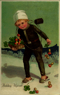 Hungarian postcard of the Chimney Sweep with red fly mushrooms (c. 1930)