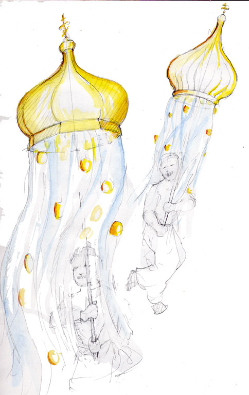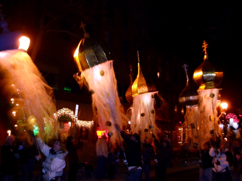 Cultures originating in Eastern Europe – Ukrainian, Carpatho-Rusyn, Russian, Slovak, and others – came to Broome County in large numbers during the early 20th-century to work in the burgeoning shoe factories fo Endicott-Johnson. It was not long before the first of many Othodox Christian churches, with their distinctive gilded domes began to appear in the urban landscape of Johnson City, Endicott, and Binghamton. Greeks, also practicing Orthodox Christianity, also became a major presence in Broome County during the same period. Many of those we interviewed from Eastern European backgrounds marked their New Year within the ethos of the Church, in particular through folk rituals associated with water. Several recalled a tradition of washing in a basin of water that has gold or silver coins at the bottom. It was thought that this ritual would insure good fortune for the coming year. Epiphany celebrates the Baptism of Christ, and is commemorated in many churches through a blessing of waters, after which consecrated water brought out into the communiy to bless the households of the congregation. Similarly, ethnic Greek tradition marks St Basil's Day (January 1) with a a cleansing or emptying of vessels, or the suspension of a cross with a sprig of basil over water in wooden bowl. The Greeks, rather than placing coins in a basin, bake a single coin into a pie, conferring luck to the person who finds it. We fused these many intertwined traditions into a processional element embodying three basic Eastern Orthodox themes: the Church, the waters, and the coins. For First Night each of seven domes from the local churches was replicated faithfully, and carried aloft in the procession. Beneath each dome, and illuminated curtain of (simulated) water cascaded down amidst suspended gold and silver coins.