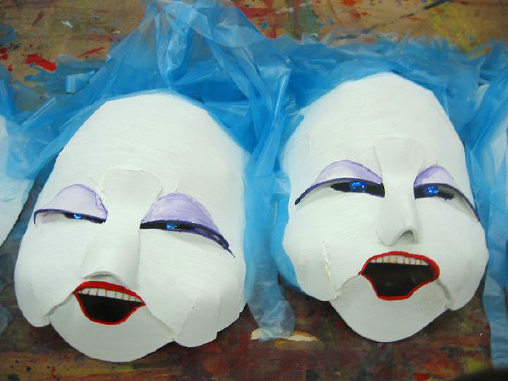 Sirens (inspired by Japanese Noh ghost masks) before mounting on their umbrella bodies.