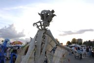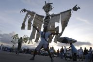 Instead of carrying his open ledger, our Bookman has actually become the book, as if a mass of discarded paper had suddenly come to life. The pile of newspapers that form his torso reveal a relentless accumulation of sensationalist headlines, sowing the seeds of fear, division, and immobility in Trinidad. His head and arms are made from a dismembered TT phonebook, whose neutral accounting of names implies a non-hierarchical (i.e. Carnivalesque) space where divisions disappear. Our Bookman, played with aplomb by a Trinidadian named Ravin, opened his cloak repeatedly to passers-by, like a stolen watch salesman surreptitiously displaying his wares. Then, extending the puppet's outstretched index finger towards a single name, he admonished them, "Look here! Yuh in de book, too! "