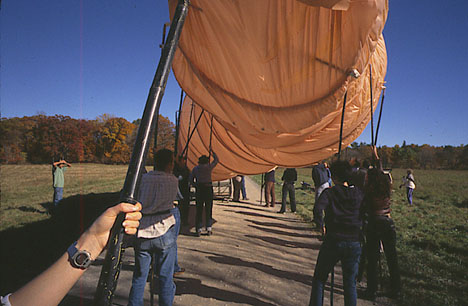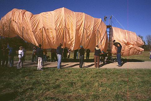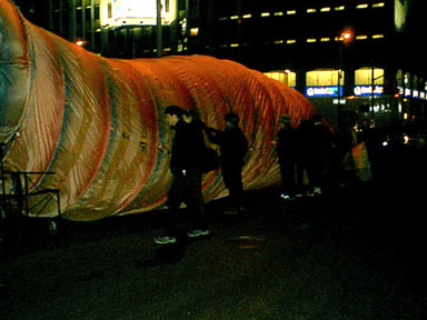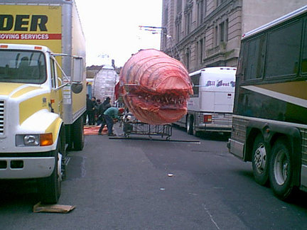 Puppeteers from Bard College beginning lifting the worm, 2 poles at a time.