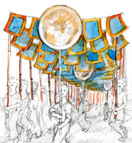 HISTORY: A Bridge Reborn OPENING PROCESSION: Water, Steam, Air The Walking on Air Procession marked the first public steps across the Walkway, as the bridge became the stage for a site-specific performance artwork created and performed by several thousand volunteers. Two simultaneous processions set out from opposite ends of the bridge, embodying not only the east and west shores now joined by the Walkway, but also the history of the Hudson itself as a convergence point of cultures (native and European), economies (maritime and local), and ecologies (salt and freshwater). We set up our ad hoc workshop in an empty storefront on Main Street in Poughkeepsie (a generous donation by local businessman, Jim Milano). Over a span of several months, more than 200 local volunteers came through the doors, not contributing not only their handiwork but also personal stories, historical minutiae, and images – all detailing a complex, deep, and multigenerational relationship with the bridge. Some were the children or grandchildren of rail workers. Others grew up in the waterfront neighborhood, watching endless cars pass over its eastern span. And some remembered sneaking onto the abandoned bridge in its as teenagers. As we collected these stories, we incorporated them into the overall design plan, which evolved into a highly personal expression of local history. The procession evoked three distinct periods in the bridge’s history. Act One, entitled Water, explored the early maritime history and unique tidal ecology of the Hudson. Act Two, Steam, celebrated the architecture of the Rail Bridge itself, and its role in the industrial age of coal and commerce. Act Three, Air, completed the upward progression and celebrated what the bridge had become, a breathtaking passage into thin air. We developed simple wind-engines to catch the wind and mark the transformation of the bridge into a human-centered space, and our transcendence from the Coal Age to an imminent future of local, human-scaled power. 50 TOWNS and 50 ARTISTS: Flags and Emblems The overall intent of the Walking on Air Procession was to create an essentially grassroots local event, yet on a monumental scale befitting the structural and historical stature of the Bridge. With this in mind, Walkway Celebration Coordinator Jeanne Fleming tasked us to come up with a design plan for elements that could be created in the 50 towns and villages on either side of bridge. In June, we led workshops throughout Ulster and Dutchess Counties to lay the groundwork for selected artists to make 50 individual Town Emblems and to lead their communities in the creation of thousands of unique flags, to be carried as a canopy of local color. The resulting Parade of the Towns enlisted the artistic reflections over a thousand Hudson Valley participants of all ages and backgrounds. |